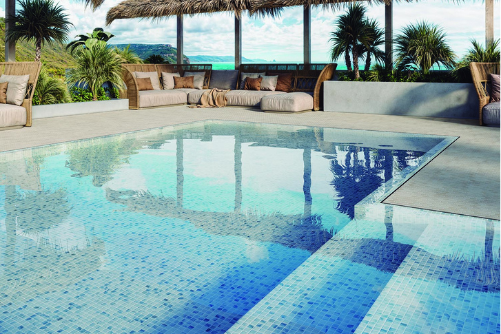 Blaue Glasmosaike sind traditionell sehr beliebt, um Pools zu gestalten. Ihre glänzenden Oberflächen verstärken die Leuchtkraft des Wassers, erinnern an das Meer und setzen lebendige Akzente. Moderne Designs und Keramikformate orientieren sich an der klassischen Schönheit der kleinen Quadrate, interpretieren diese jedoch neu. Klare Linien und zarte Muster folgen einer reduzierten Ästhetik und strahlen visuelle Ruhe aus.