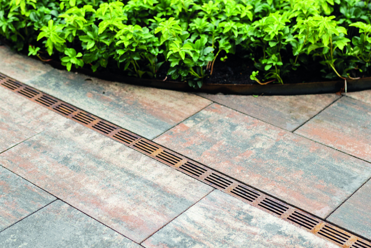 Ob Fliesen-, Natur- und Betonstein oder Feinsteinzeug-Oberflächen – mit nur sechs Zentimetern Breite fügt sich die begehbare Entwässerungsrinne dezent und unauffällig in die Fläche rund ums Haus ein. Weitere optische Akzente auf der Terrassenfläche lassen sich durch die Slimline-Designroste aus schwarz oder silber eloxiertem Aluminium, Cortenstahl oder Edelstahl setzen.