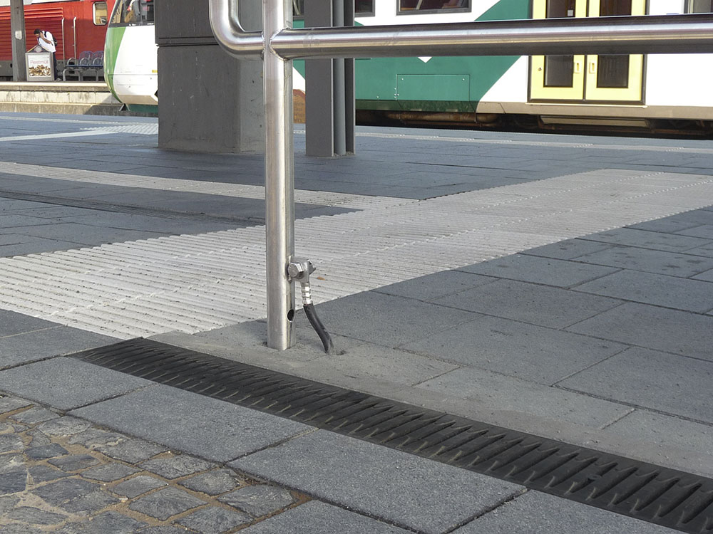 Besonderes Highlight der Produktserie ist der unverwechselbare Fibretec Stegrost aus einem Hochleistungs-Kunststoff. Ein gutes Beispiel dafür, welch enorme Entwicklung diese Entwässerungssysteme in den letzten Jahren durchlaufen haben. Dr. Bernd Schiller, Leiter der Forschungsund Entwicklungsabteilung bei Hauraton, bemerkt dazu: „Das neue Material von Hauraton ermöglicht eine Formensprache, die dem Produkt Eigenständigkeit verleiht. Hohe Belastbarkeit und eine optimierte hydraulische Leistung sind weitere wichtige Komponenten.“ Zudem gestatten Recyfix Pro Rinne den Einsatz in Bereichen,in denen besondere Sicherheitsanforderungen bestehen. Beim Bau von Bahnsteigen und Haltestellen beispielsweise müssen alle stromleitenden Bauteile entsprechend geerdet sein. Werden dagegen nichtleitende Bauteile, wie die Recyfix Pro Rinnen eingesetzt, kann viel Aufwand und Zeit beim Bau eingespart werden.