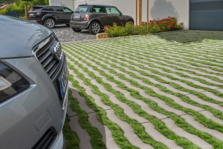 WaveLiner strukturiert beanspruchte Bereiche und bringt gestalterische Vielfalt. Mit dem Format 60 x 40 cm und 12 cm Steindicke eignet sich das Pflaster für Stellplätze, Feuerwehrzufahrten oder Aufstellflächen, die gelegentlich befahren werden. Leicht geschwungene, 50 mm breite Fugen erzeugen ein lebendiges Bild. Die Fugen lassen sich mit Splitt oder Rasen füllen. Bei Begrünung schützen die breiten Stege die Grasnarbe vor Verdichtung. So bleibt die Fläche auch bei Befahrung grün und gepflegt. Rund die Hälfte kann begrünt werden – das verbessert Mikroklima, stärkt Biodiversität und sorgt für eine natürliche Optik.