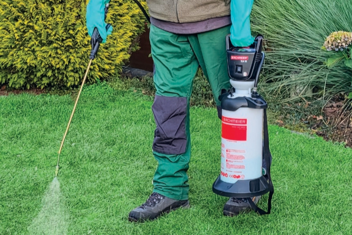 Handbetriebene Drei-, Fünf- und Sieben-Liter-Kunststoff-Druckspeichergeräte des Herstellers Birchmeier lassen sich mit dem leistungsstarken Kompressor nachrüsten - ganz im Sinne der Nachhaltigkeit.